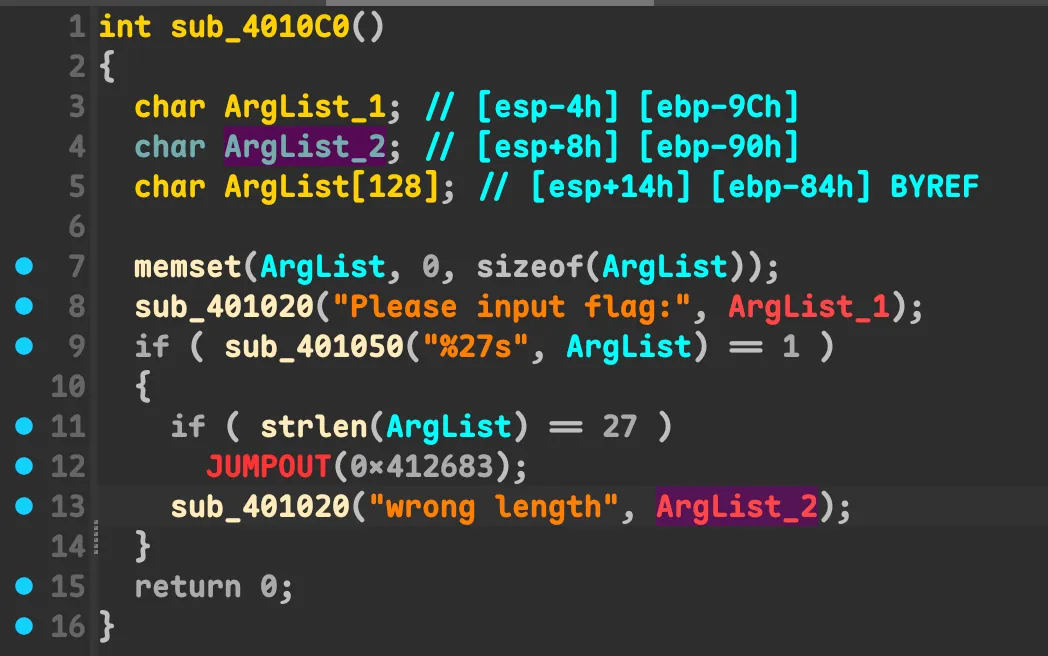 主函数是一个巨简单的验证函数,关键的加密逻辑在sub_4015F8。检验得其把用户输入当作一串方向键 W/A/S/D(分别对应上、左、下、右),在一个 16×16 的网格(线性数组 byte_4A3020)上沿直线滑动:每次沿某方向一直前进直到遇到一个非 0的格(障碍/节点);不能越界、不能连续输入相同方向,目标是最终抵达数组中值为 ’!’(33)的格子。