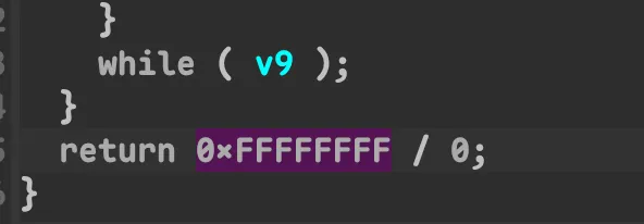 return 0xFFFFFFFF / 0; // 这里会触发除0异常,抛出浮点数异常然后触发longjmp