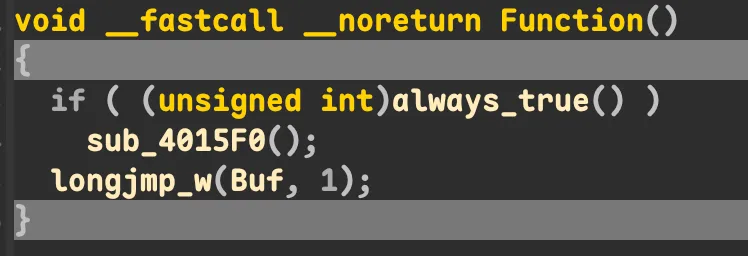 一个永真跳转,先执行sub_4015F0,再执行longjmp_w。到这里我们明白了上面的setjmp究竟起何作用:一开始Buf是0,执行XXTEA加密,然后XXTEA加密末尾通过除零触发Function,修改Buf为1并跳到setjmp处,使程序进入XOR_Encrypt的分支。